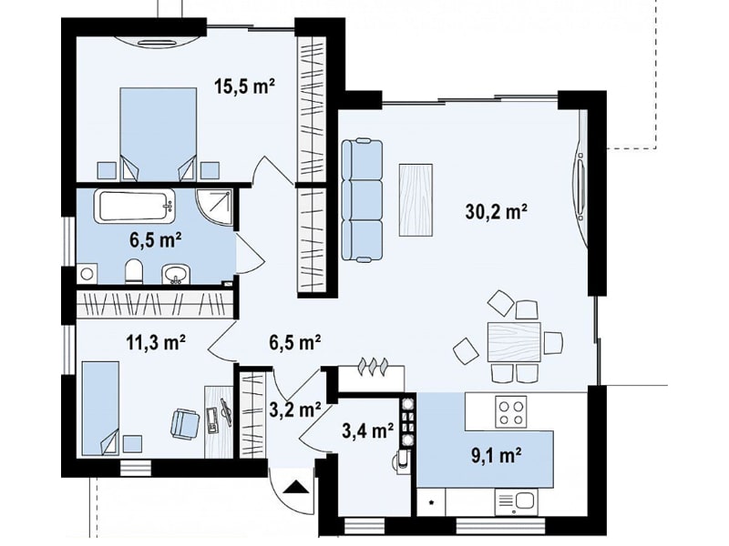 Проект «Правильный дом 4750» площадью 86 м2 — отличный вариант недорогого и комфортного жилья для вашей семьи. В одноэтажном доме (размером 9 x 9 м) выполнено удачное зонирование планировки и для каждого предусмотрены необходимые комнаты.